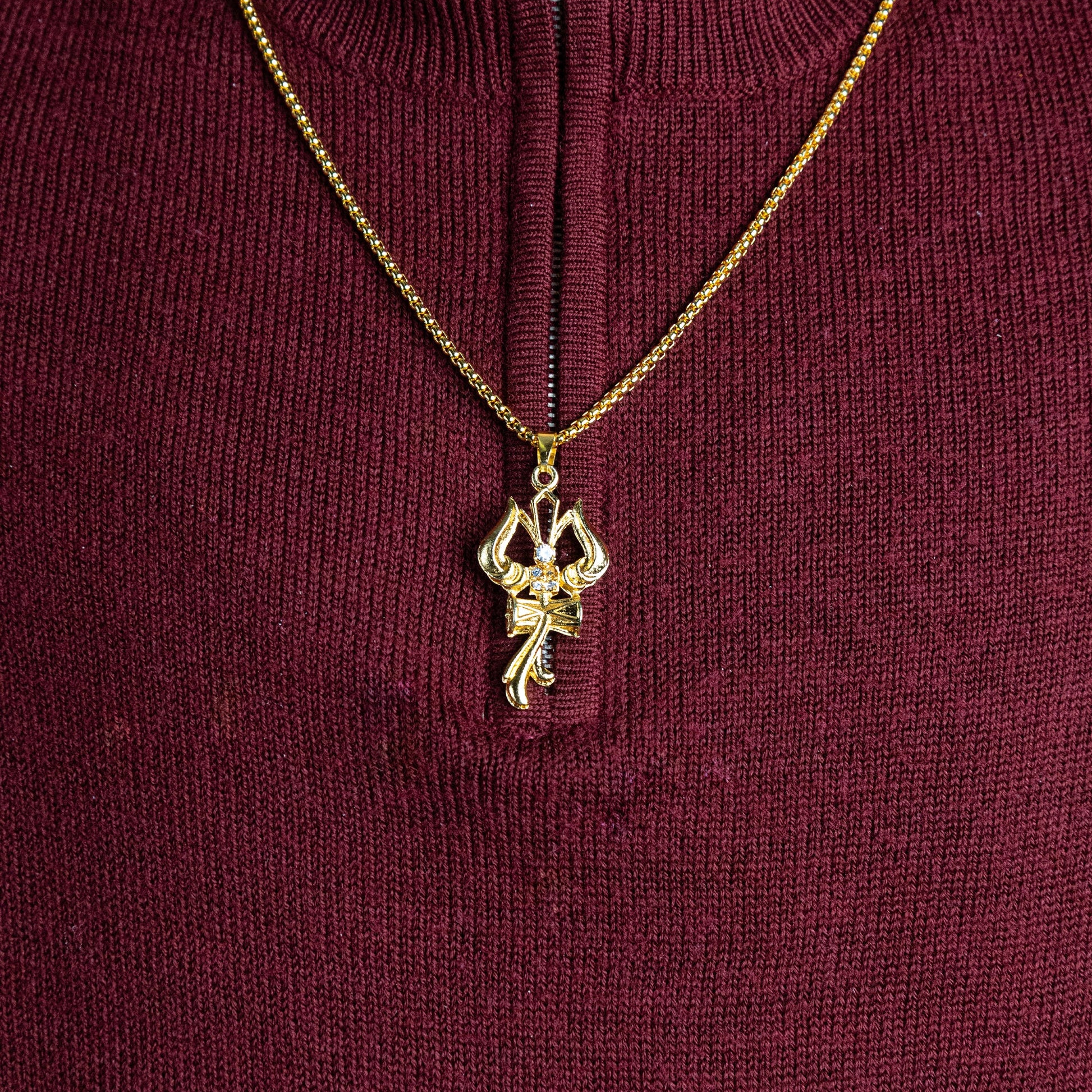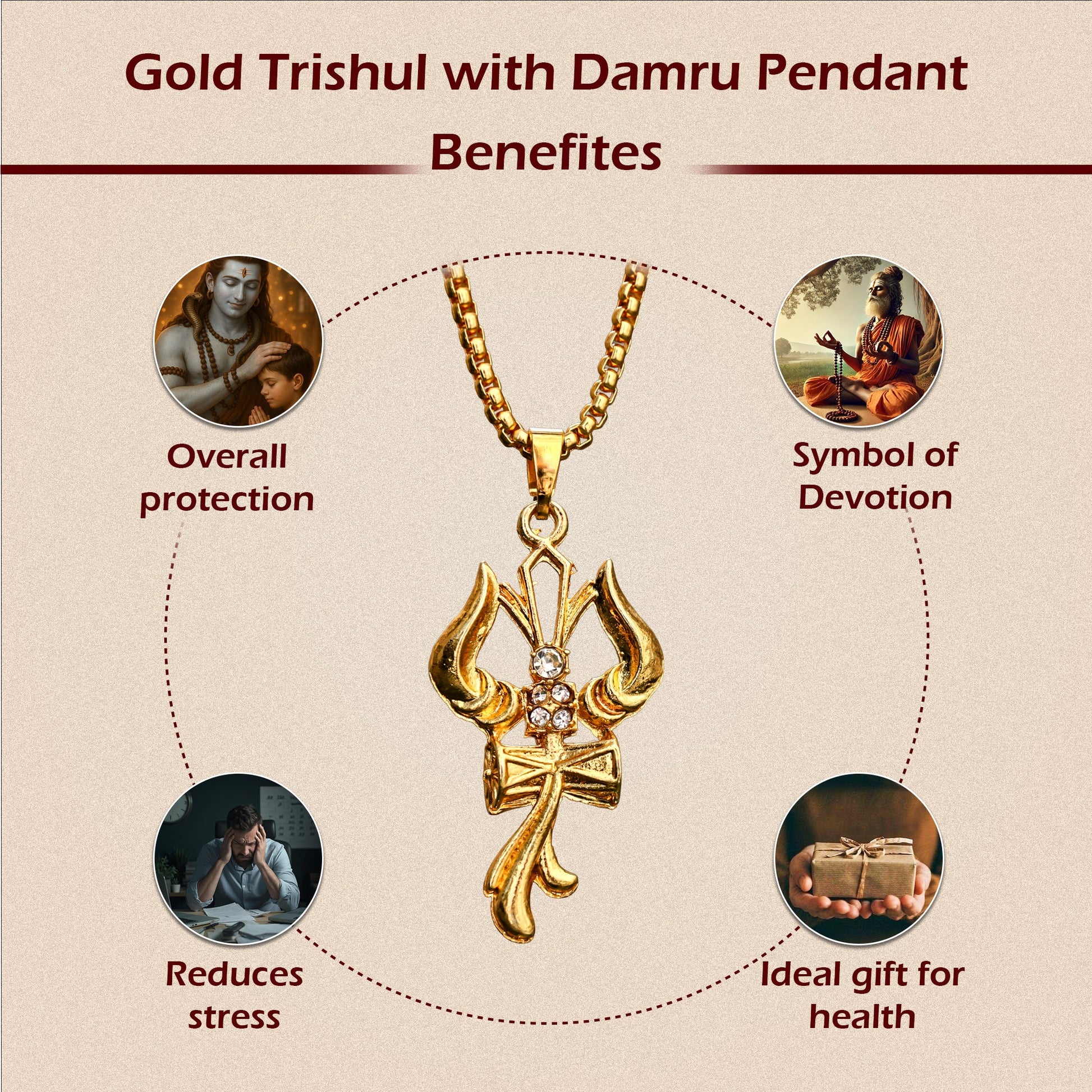 The Gold Trishul with Damru Pendant - Abhimantrit is a special symbol of Lord Shiva (भगवान शिव). It stands for protection, strength, and good energy. In Hinduism, people believe the Trishul removes problems, takes away bad energy, and brings peace and balance to life. Wearing this pendant helps you feel safe and strong in any situation.